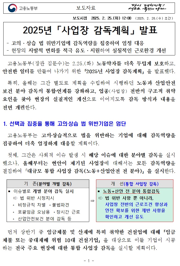 25년도 고용노동부 사업장 감독계획이 발표되었습니다.